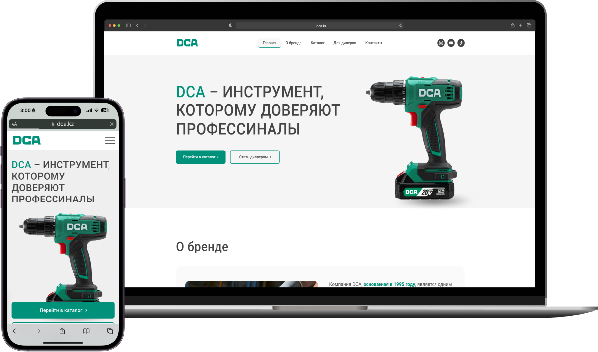 Нам предстояло создать сайт-каталог для DCA Tools — нового китайского бренда электроинструментов, который впервые выходит на рынок Казахстана.