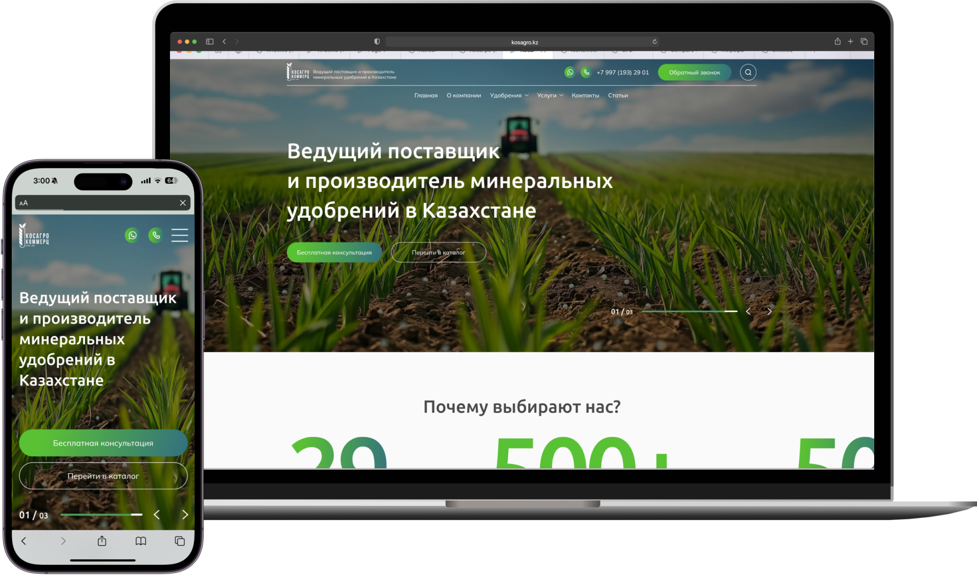 КосАгроКоммерц — крупный поставщик удобрений и агротехнических услуг в Казахстане. Компания обратилась к нам с целью обновить их устаревший сайт, сделав его современным, удобным для пользователей, и, главное, более эффективным с точки зрения продаж.